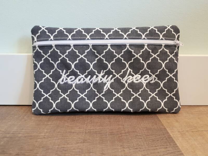 Dit zakje is natuurlijk een grapje. Er werd mij gevraagd een etui te maken waar verzorgingsmaterialen in bewaard/meegenomen kunnen worden. Hierop heb ik dit etui "In The Hoop" gemaakt. Voor geïnteresseerden staat onderaan dit bericht een filmpje wat het betekent.