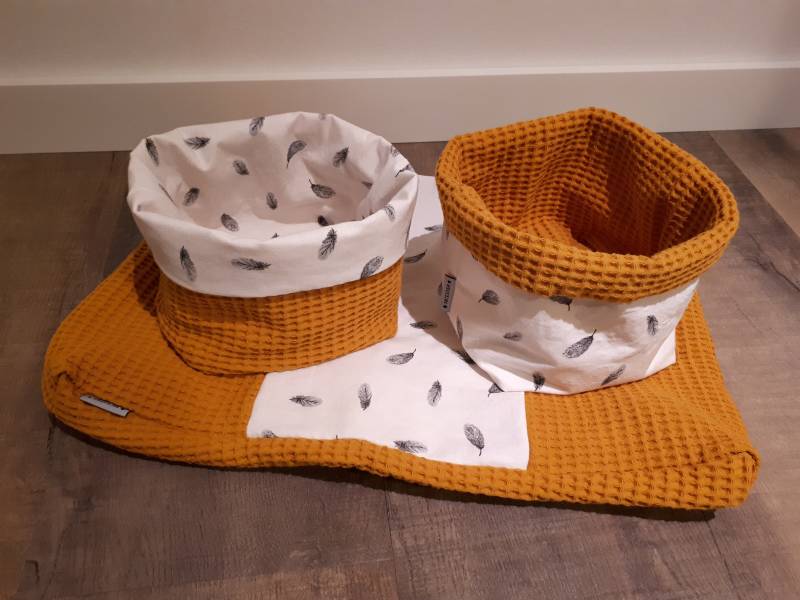 Wat is dit een leuke set geworden! 🤩 Het bestaat uit twee mandjes voor op de commode en daarnaast twee hoezen voor het aankleedkussen. Vooral de kleuren, okergeel wafelkatoen samen met witte katoen met zwarte veren, maken een mooie combinatie! 😁
