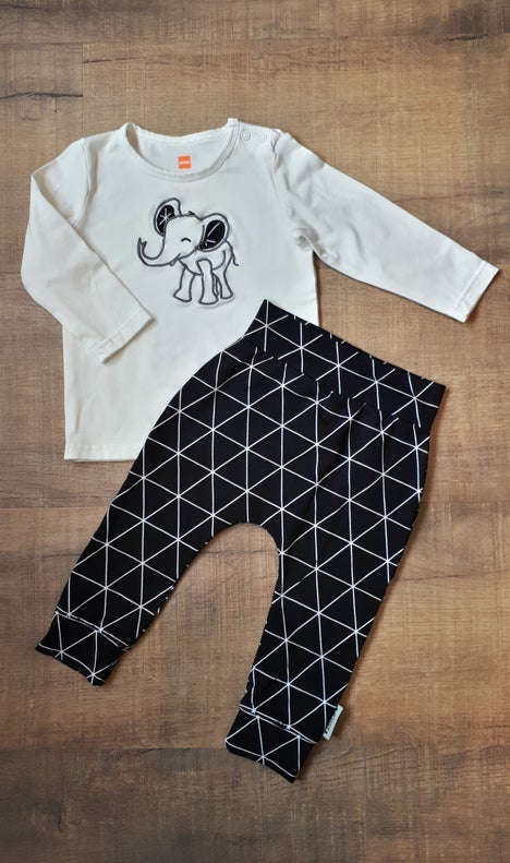 Dat heb ik ook deze keer weer gedaan. De olifant op het shirt heb ik overgenomen van de kaart. De binnenkant van de oren is "gevuld" met dezelfde stof als van de broek. Voor de broek heb ik het Oliver patroon gebruikt.
