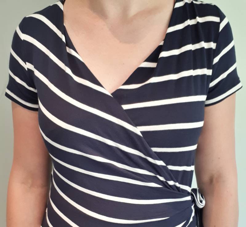 En zo kwam ze binnen in mijn hobbykamer met haar jurk aan. Ik begreep waar ze het over had, maar een omslagjurk netjes en nauwkeurig vastzetten dat is nog niet zo makkelijk. Dus soms is het resultaat het beste als je iets minder nauwkeurig werkt omdat het gewoon het beste bij de jurk past. Een nieuwe uitdaging met een goed resultaat! 😎
