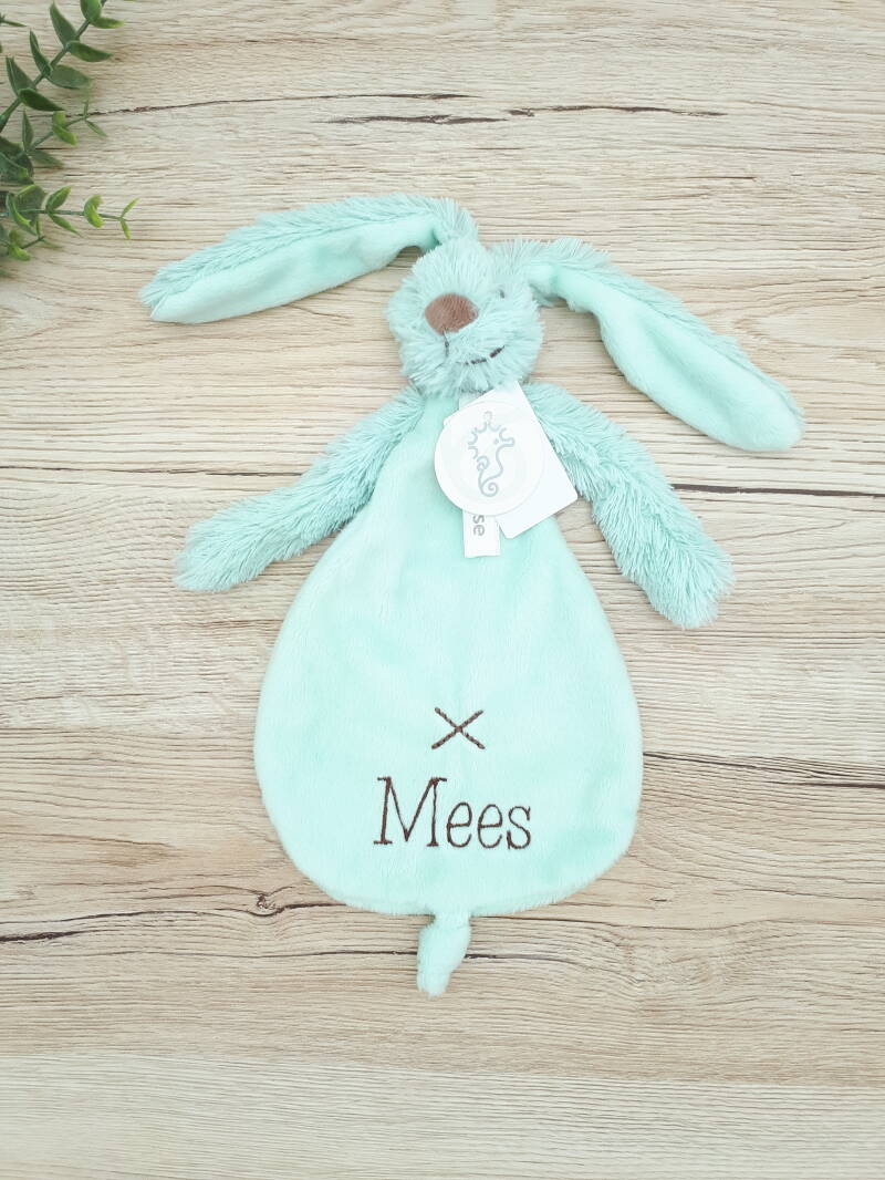 Deze Richie Tuttle in de kleur mint is voor Mees! De naam is in de kleur van de neus/het naveltje/de ogen geborduurd. Natuurlijk zijn de borduursteken niet zichtbaar aan de achterkant van het doekje. De achterkant van de knuffel blijft hierdoor lekker zacht! 😍 Leuk om als kraamcadeau te geven!