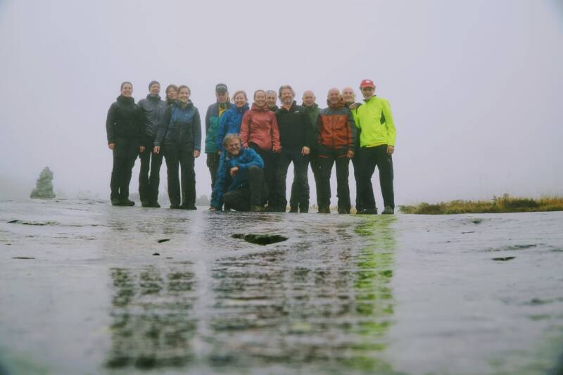 We hebben eerst met de groep (op 1 loper en de 2 koks na) op de plek waar voorheen een gletsjer lag, een groepsfoto gemaakt.